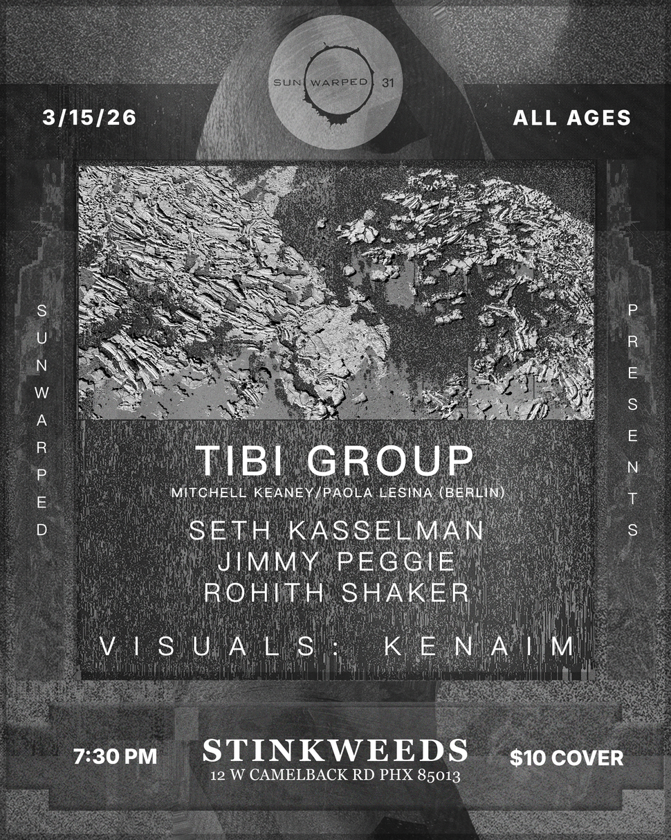 3/15 at Stinkweeds featuring Tibi Group (Berlin), Seth Kasselman, & first time Sunwarped performances from Jimmy Peggie and Rohith Shaker. Visuals by Kenaim